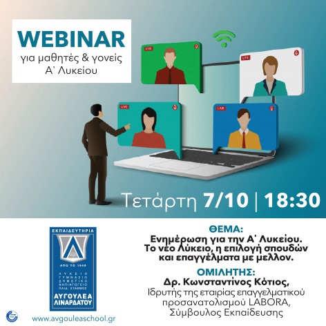 Το σχολείο μας, στο πλαίσιο της έγκαιρης και έγκυρης ενημέρωσης των μαθητών και των γονέων, διοργανώνει WEBINAR επαγγελματικού προσανατολισμού με τίτλο «ΟΙ ΑΛΛΑΓΕΣ ΣΤΟ ΛΥΚΕΙΟ ΚΑΙ ΣΤΙΣ ΠΑΝΕΛΛΗΝΙΕΣ» σε συνεργασία με την επιστημονική ομάδα της LABORA Σύμβουλοι Εκπαίδευσης (www.labora.gr) και ομιλητή τον Δρ Κότιο Κωνσταντίνο, σύμβουλο εκπαίδευσης και καριέρας και ιδρυτή της. Το webinar περιλαμβάνει αναλυτική και στοχευμένη ενημέρωση για μαθητές των τελευταίων τάξεων Γυμνασίου και των τάξεων του Λυκείου, καθώς και για γονείς και εκπαιδευτικούς. Ενδεικτικά, […]