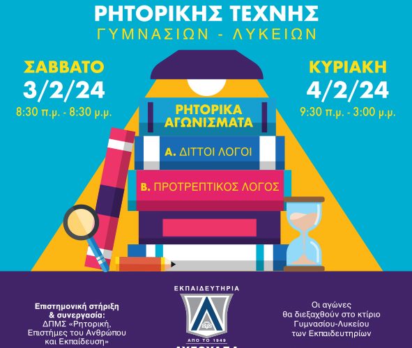 Η Ρητορική πάντοτε δίνει τον λόγο στους νέους, χαρίζει χαμόγελα σε μαθητές, εκπαιδευτικούς, γονείς και φιλους! Ενώνει νέους από όλη την Ελλάδα και κάνει τη φωνή τους πιο δυνατή! Ανανεώνουμε, λοιπόν, το ετήσιο ρητορικό ραντεβού μας… Στις 3 και 4 Φεβρουαρίου 2024 τα Εκπαιδευτήρια Αυγουλέα – Λιναρδάτου διοργανώνουν τους I’ Αγώνες Ρητορικής Τέχνης Γυμνασίων και Λυκείων με τα αγωνίσματα των Διττών Λόγων και του Προτρεπτικού Λόγου. Οι αγώνες γίνονται με την επιστημονική στήριξη και συνεργασία … Συνεχίστε να διαβάζετε το I’ Αγώνες Ρητορικής Τέχνης Γυμνασίων και Λυκείων.