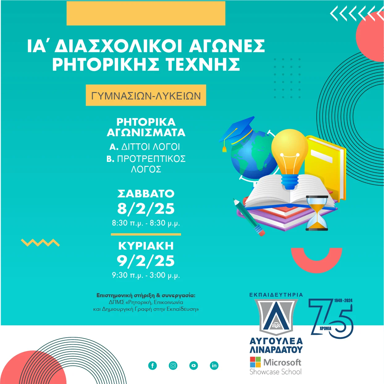 Η Ρητορική πάντοτε δίνει τον λόγο στους νέους, χαρίζει χαμόγελα σε μαθητές, εκπαιδευτικούς, γονείς και φιλους! Ενώνει νέους από όλη την Ελλάδα και κάνει τη φωνή τους πιο δυνατή!Ανανεώνουμε, λοιπόν, το ετήσιο ρητορικό ραντεβού μας…Στις 8 και 9 Φεβρουαρίου 2025 τα Εκπαιδευτήρια Αυγουλέα – Λιναρδάτου διοργανώνουν τους IΑ’ Αγώνες Ρητορικής Τέχνης Γυμνασίων και Λυκείων με τα αγωνίσματα των Διττών Λόγων και του Προτρεπτικού Λόγου.Οι αγώνες γίνονται με την επιστημονική στήριξη και συνεργασία του ΔΠΜΣ «Ρητορική, Επικοινωνία και Δημιουργική Γραφή στην Εκπαίδευση».