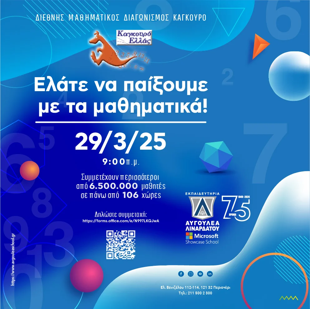 Δείτε παλαιότερα θέματα "εδώ"Ο διαγωνισμός Καγκουρό για το 2025 θα διεξαχθεί στις 29 Μαρτίου στις 9:00 π.μ. Το σχολείο μας για 15η συνεχόμενη χρονιά έχει την τιμή να είναι εξεταστικό κέντρο τόσο για τους μαθητές του όσο και για μαθητές άλλων σχολείων. Για να δηλώσετε τη συμμετοχή σας στο διαγωνισμό συμπληρώστε την παρακάτω φόρμα.https://forms.office.com/e/N997LKQJwAΗ ολοκλήρωση της εγγραφής γίνεται με την καταβολή του αντιτίμου της συμμετοχής (14 €) ΔΙΑ ΖΩΣΗΣ στη Γραμματεία Γυμνασίου-Λυκείου των εκπαιδευτηρίων μας κατά τις ώρες λειτουργίας της (8:00 π.μ – 8:00 μ.μ ).