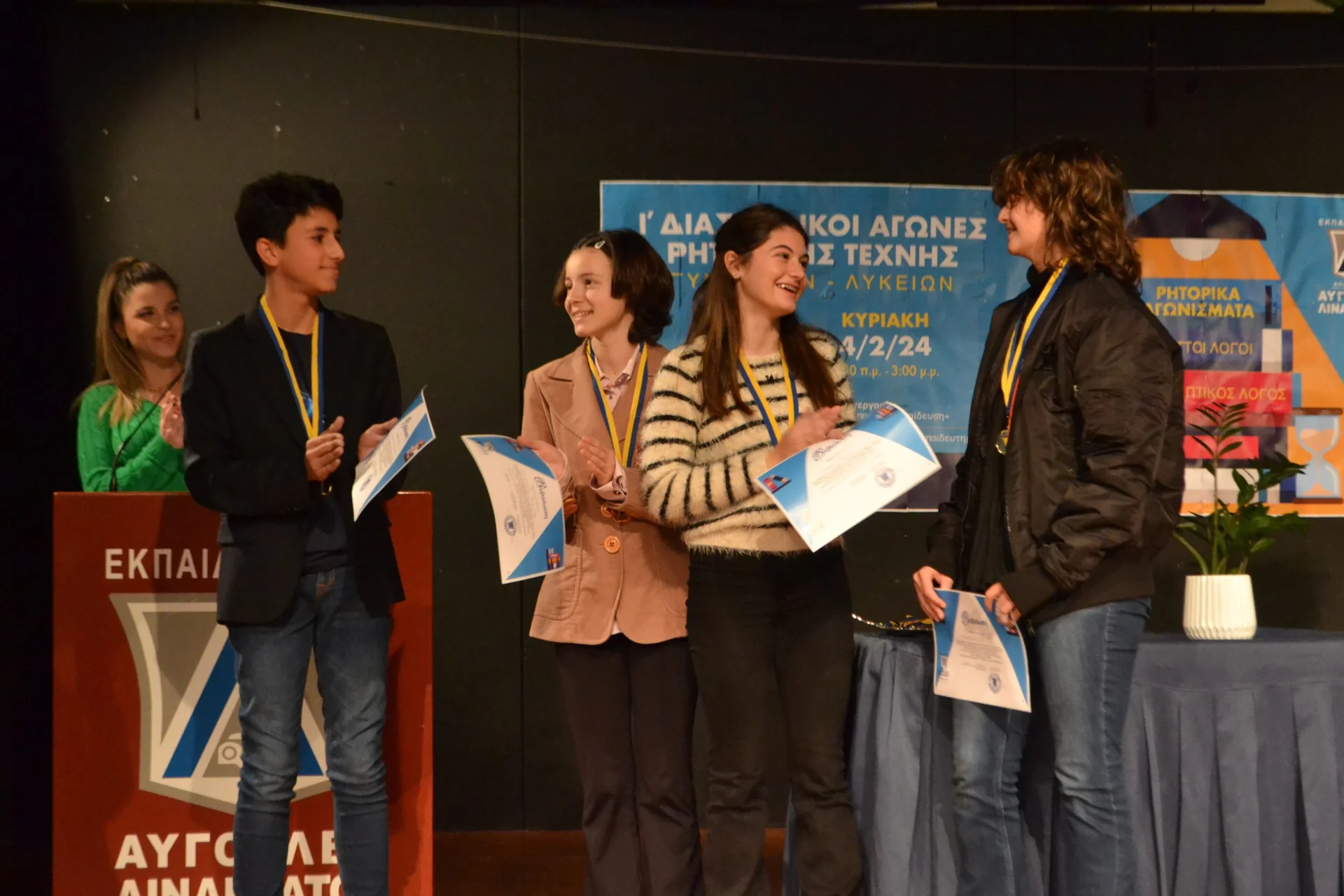 Το Σαββατοκύριακο 3 και 4 Φεβρουαρίου 2024 το σχολείο μας για 10η συνεχή χρονιά διοργάνωσε τους Διασχολικούς αγώνες Ρητορικής Τέχνης Γυμνασίων και Λυκείων. Φιλοξενήθηκαν μαθητές, μαθήτριες και εκπαιδευτικοί από 19 γυμνάσια και 22 λύκεια της Αττικής, της Άνδρου και της Κορίνθου. Οι μαθητές πήραν μέρος στα ρητορικά αγωνίσματα των Διττών Λόγων και του Προτρεπτικού λόγου ανταλλάσσοντας μεταξύ τους απόψεις, ιδέες, συναισθήματα και βιώνοντας αξέχαστες εμπειρίες!Το σχολείο μας είχε εξαιρετικά αποτελέσματα!Η ομάδα των Διττών Λόγων του Γυμνασίου μας, που έφτασε στον Τελικό γύρο και αναδείχθηκε 2η, αποτελείται από τους μαθητές της Γ΄ γυμνασίου: Καραπιδάκη Άνθη, Μαρτσούκου Αλεξία, Πιοτόπουλο Βαγγέλη και τους μαθητές της Β΄ γυμνασίου: Κιντή Εύη, Νέζη Παναγιώτη, Ράγκο Άγγελο, και Σουρίδη Βασιλική.Η ομάδα των Διττών Λόγων του Λυκείου μας, έφτασε στον Ημιτελικό γύρο, αναδείχθηκε 3η και αποτελείται από τη μαθήτρια της Γ΄ λυκείου Μωραΐτη Άννα, καθώς και τους μαθητές της Α΄ λυκείου: Βρέντα Σωτήρη, Ζακυνθινού Αναστασία, Τερζακοπούλου Μάντλιν, Πανταζοπούλου - Μπούμπουρα Δανάη, Ζαρόκωστα Κωνσταντίνα και Μαρτσούκου Ελεάννα.Στο αγώνισμα του Προτρεπτικού Λόγου επίσης οι μαθητές μας είχαν εξαιρετική παρουσία!Πιο συγκεκριμένα, στο Γυμνάσιο 3η καλύτερη ομιλήτρια αναδείχθηκε η μαθήτρια της Β΄ Γυμνασίου Παράσχη Φωτεινή, την 5η θέση κατέλαβε η μαθήτρια της Β΄ Γυμνασίου Μαυρογιώργου Νικολαΐς, την 6η η μαθήτρια της Γ΄ Γυμνασίου Καραπιδάκη Άνθη και την 9η θέση η μαθήτρια της Β΄ γυμνασίου Κιντή Εύη.Στους Προτρεπτικούς του Λυκείου την 6η θέση κατέλαβε η μαθήτρια της Β΄ Λυκείου Δημοπούλου Ελένη-Ιωάννα και την 8η ο μαθητής της Α΄ λυκείου Καρακώστας Γιάννης.Καλύτεροι ομιλητές των Διττών Λόγων στο Λύκειο αναδείχθηκαν στην 6η θέση η Μωραΐτη Άννα και στη 10η θέση η Ζακυνθινού Αναστασία.Καλύτεροι ομιλητές των Διττών Λόγων στο Γυμνάσιο αναδείχθηκαν στην 3η θέση η Καραπιδάκη Ανθή, στην 5η θέση η Μαρτσούκου Αλεξία και στην 7η θέση η Κιντή Εύη.Οι αγώνες είχαν την στήριξη και συνεργασία τους ΔΠΜΣ «Ρητορική, Επιστήμες του Ανθρώπου και Εκπαίδευση». Την Επιστημονική Επιτροπή απάρτιζαν οι κ.κ. :Τζίνα ΚαλογήρουΚαθηγήτρια Νεοελληνικής Λογοτεχνίας και της Διδακτικής της , ΠΤΔΕ/ΕΚΠΑ, Διευθύντρια του ΔΠΜΣ «Ρητορική, Επιστήμες του Ανθρώπου και Εκπαίδευση»Γραμματική ΚάρλαΑναπληρώτρια Καθηγήτρια Κλασικής Φιλολογίας Τμήματος Φιλολογίας Φιλοσοφικής Σχολής ΕΚΠΑΙορδάνης Κουμασίδης, δ.φ.Διδάσκων, Εθνικό Καποδιστριακό Πανεπιστήμιο Αθηνών – Ελληνικό Ανοικτό ΠανεπιστήμιοΜανώλης Μ. Στεργιούλης , δ.φ.Διδάκτωρ Φιλολογίας, τ. Σχολικός Σύμβουλος Δ.Ε.Γεωργία ΚατσούδαΕρευνήτρια Ερευνών στο Κέντρον Ερεύνης των Νεοελληνικών Διαλέκτων και Ιδιωμάτων, Ακαδημία Αθηνώνκάντε κλικ εδώ για να δείτε φωτογραφίες